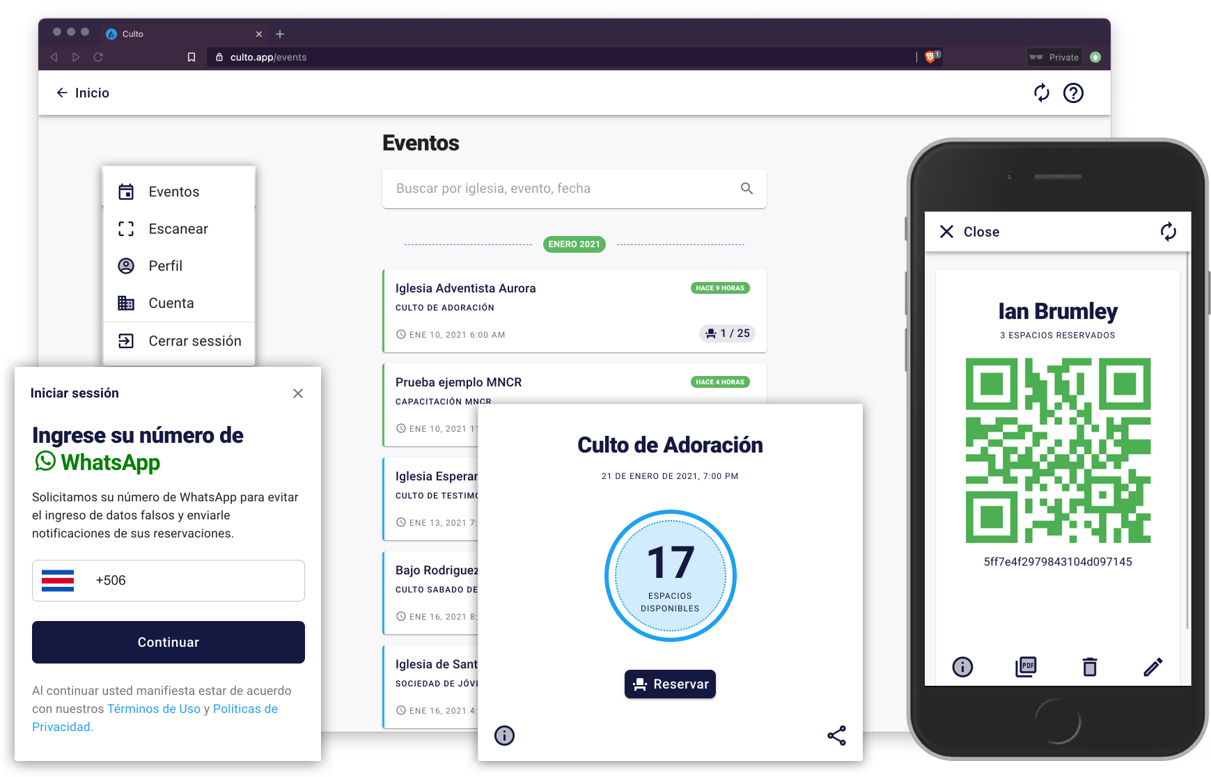 Mario reserva 3 espacios para él y su familia en Culto ingresando su número de teléfono.